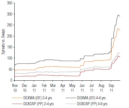 According to the RBS analysts Dexia’s covered bond spreads stabilised toward the end of last week following an “ugly” widening since the end of August, but they added that the differential between the group’s Pfandbriefe and obligations foncières across maturities remains “exceptionally wide” at 150bp-200bp (see chart below).
